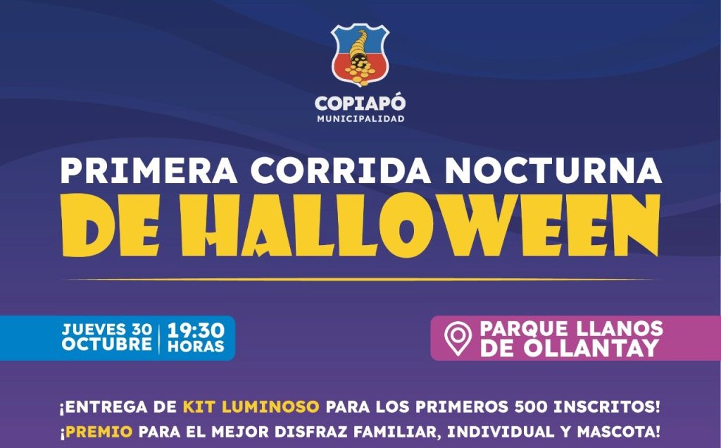 Una jornada deportiva diferente y llena de energía se vivirá este jueves 30 de octubre desde las 19:30 horas en el Parque Llanos de Ollantay, con la primera Corrida Nocturna “Halloween 2025”, evento organizado por la Ilustre Municipalidad de Copiapó, a través de su Unidad Técnica de Deportes.