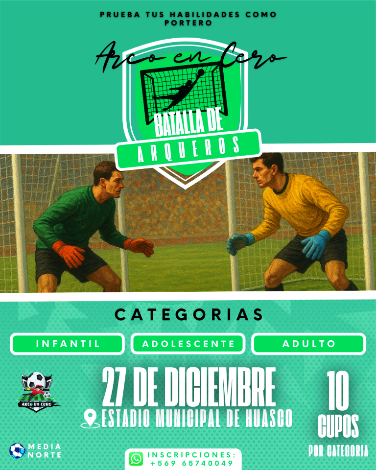 El evento se desarrollará el próximo 27 de diciembre en el Estadio Municipal de Huasco y está dirigido a arqueros y arqueras de toda la Región de Atacama, quienes se enfrentarán en duelos 1 vs 1, donde deberán demostrar sus capacidades técnicas tanto para convertir como para atajar goles, en un tiempo determinado. Consultas e inscripciones al whatsapp +56 9 65740049