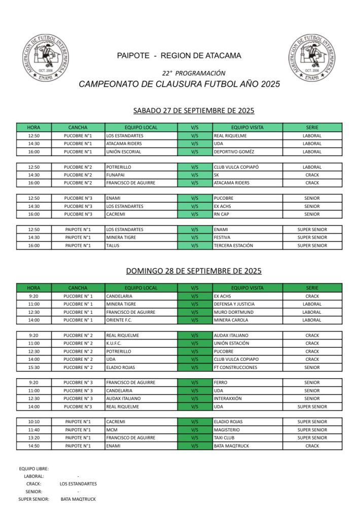 Este fin de semana de septiembre en las canchas Pucobre 1, 2 y 3 se juega la programación número 22 del año 2025 en el ya tradicional torneo Inter Empresa de Copiapó.