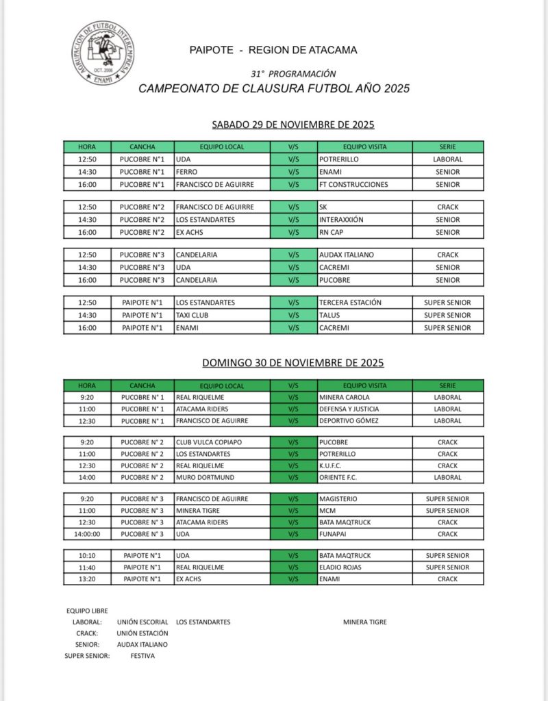 Este fin de semana en las canchas Paipote 1 y Pucobre 1, 2 y 3 se juega la programación número 31 del año 2025 en el ya tradicional torneo Inter Empresa de Copiapó.