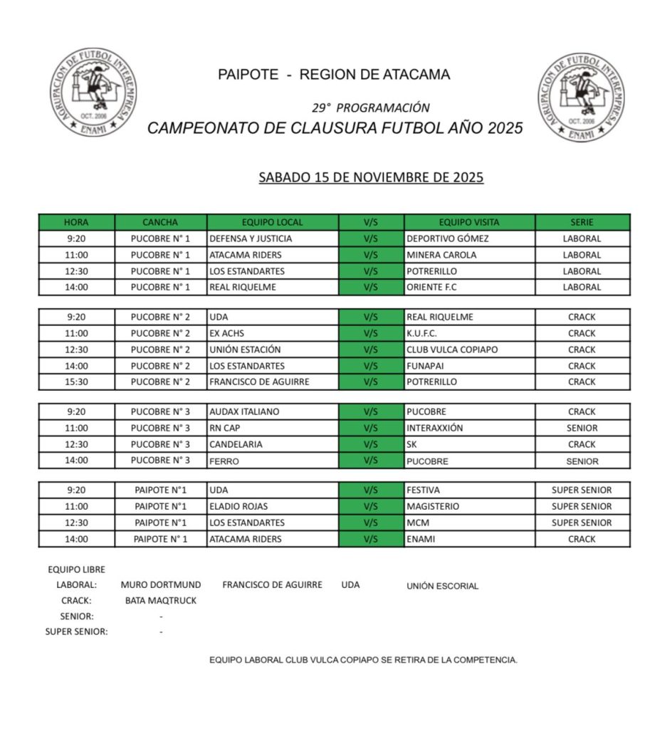 Este fin de semana en las canchas Paipote 1 y Pucobre 1, 2 y 3 se juega la programación número 29 del año 2025 en el ya tradicional torneo Inter Empresa de Copiapó.
