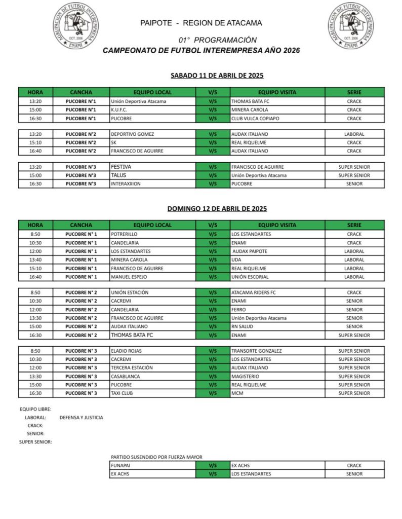 Este fin de semana en las canchas Pucobre 1, 2 y 3 serán el escenario de la primera fecha del Campeonato de Futbol Interempresa 2026, los equipos iniciarán el torneo con la ilusión de campeonar este 2026