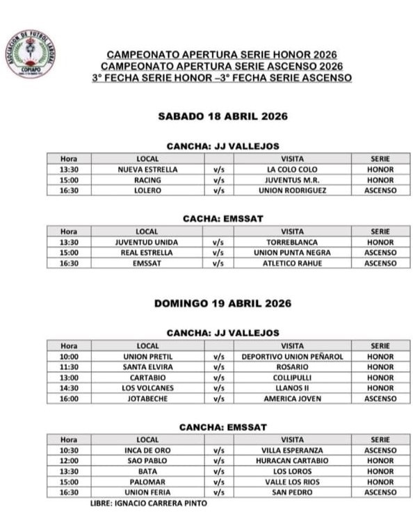 Este sábado 18 y domingo 19 de abril se jugará la segunda fecha del Campeonato de Apertura de las series Honor y Ascenso de la Asociación Laboral de Fútbol en Copiapó.
