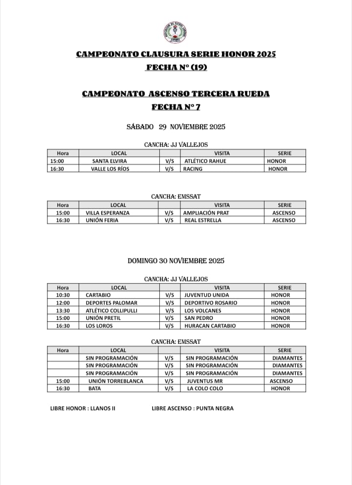 Este fin de semana se jugará la fecha 19 del Campeonato Clausura Serie Honor del Clausura y la 7ma de la 3ra Rueda del Ascenso en el Campeonato de Fútbol Laboral de Copiapó.