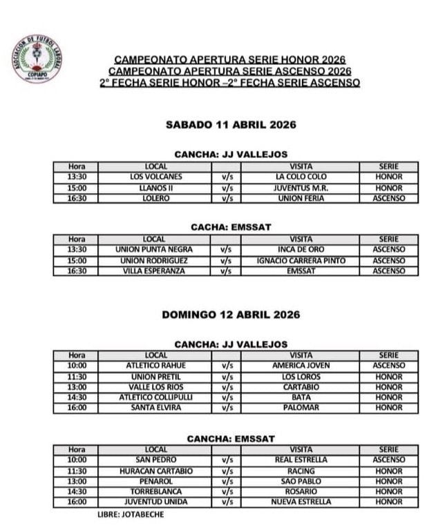 Este sábado 11 y domingo 12 de abril se jugará la segunda fecha del Campeonato de Apertura de las series Honor y Ascenso de la Asociación Laboral de Fútbol en Copiapó.