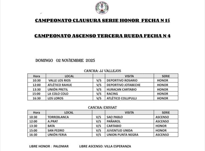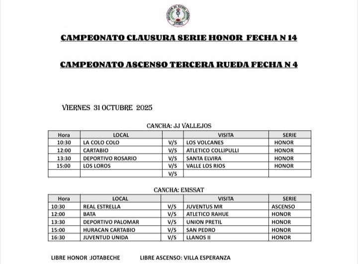 Este fin de semana largo 31 de octubre y 2 de noviembre se jugará la fecha 14 y 15 del Campeonato Clausura Serie Honor y la fecha 4 del Clausura Ascenso en el Campeonato de Fútbol Laboral de Copiapó.