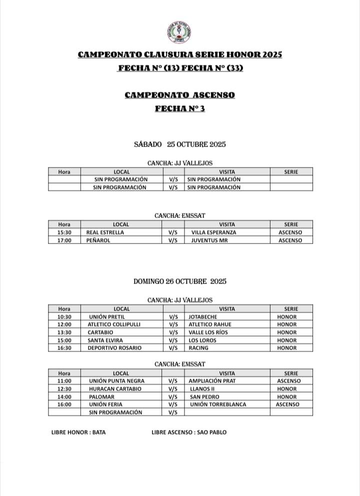 Este fin de semana 25 y 26 de octubre se jugará la fecha 13 del Campeonato Clausura Serie Honor y la fecha 3 del Clausura Ascenso en el Campeonato de Fútbol Laboral de Copiapó.