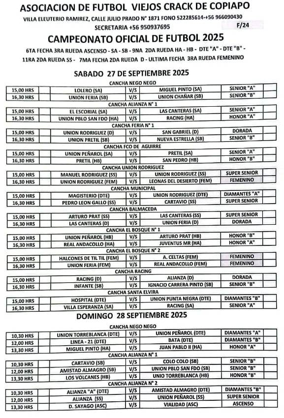 Este sábado y domingo, las canchas de Copiapó serán escenario de una nueva fecha del Campeonato Oficial 2025 de la Asociación de Fútbol Viejos Crack, los equipos de las distintas series se enfrentarán en otra fecha del torneo, que promete acción y mucha pasión futbolera.