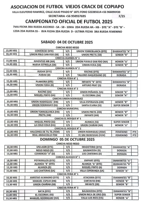 Este sábado y domingo, las canchas de Copiapó serán escenario de una nueva fecha del Campeonato Oficial 2025 de la Asociación de Fútbol Viejos Crack, los equipos de las distintas series se enfrentarán en otra fecha del torneo, que promete acción y mucha pasión futbolera.
