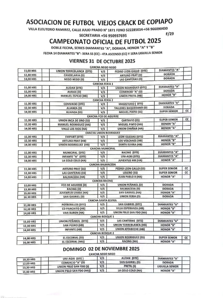 Este Viernes, sábado y domingo, las canchas de Copiapó serán escenario de una nueva fecha del Campeonato Oficial 2025 de la Asociación de Fútbol Viejos Crack, los equipos de las distintas series se enfrentarán en otra fecha del torneo, que promete acción y mucha pasión futbolera.