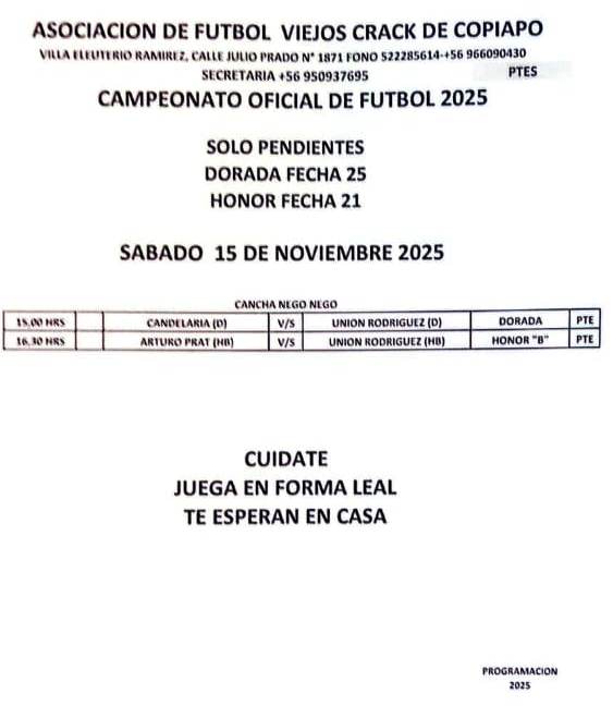 Este sábado 15 de noviembre, la cancha Nego Nego de Copiapó será escenario de 2 partidos pendientes del Campeonato Oficial 2025 de la Asociación de Fútbol Viejos Crack.